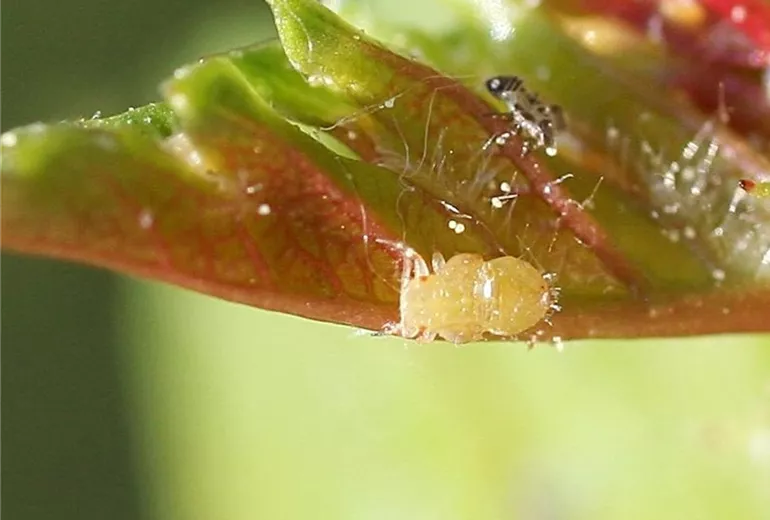 Durch die Saugtätigkeit kann es zu rötlichen Verfärbungen der Blätter kommen. Bei starkem Befall sterben die jungen Blättchen auch teilweise ab.