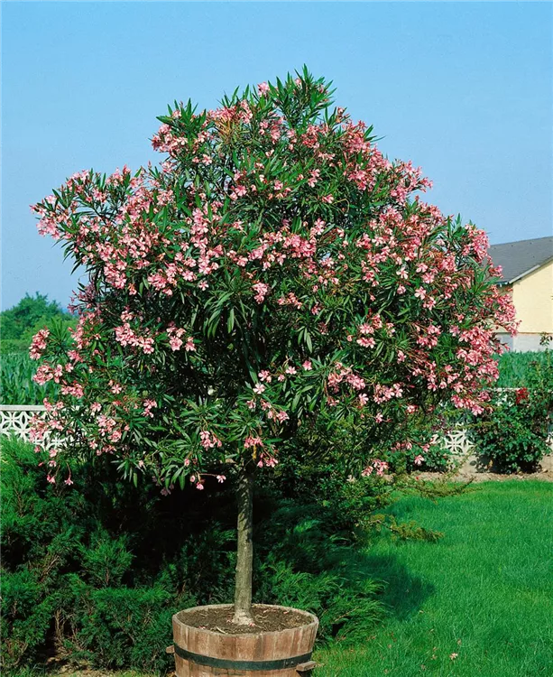 Der Oleander, Stamm (Nerium oleander) ist eine sehr beliebte Kübelpflanze. Seine rosafarbenen, weißen oder gelben Blüten erscheinen von Juni bis September. Verwenden Sie bevorzugt die spezielle Kübelpflanzenerde, denn sie verdichtet sich über längere Zeit nicht.