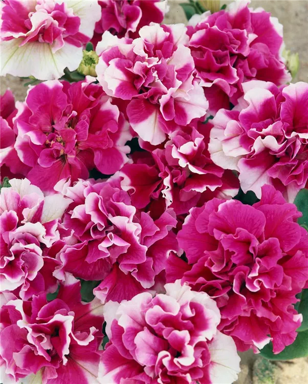 Die Petunie (gefüllt blühend) (Petunia) ist eine beliebte Pflanze für den Balkon. Die unzähligen Blüten erscheinen, je nach Sorte, in verschiedenen Farben die ganze Saison hindurch. Ein sonniger Standort und ein durchlässiges Substrat werden bevorzugt.