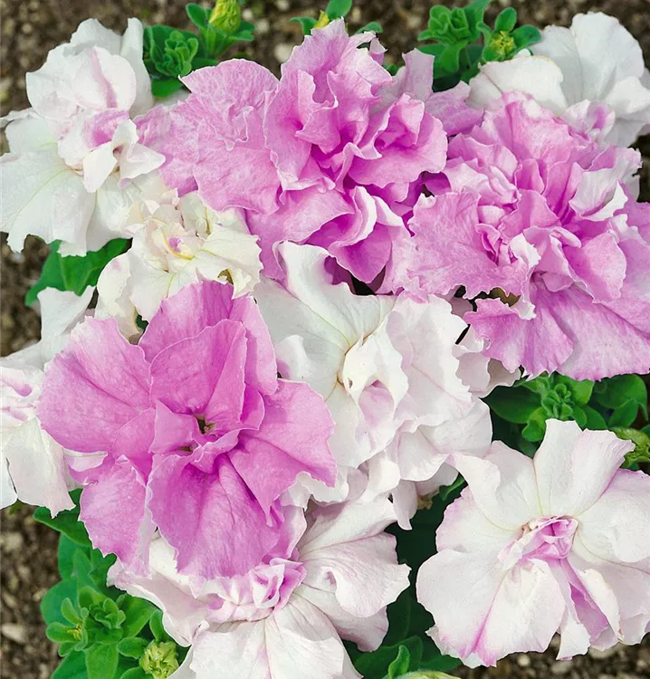 Petunia, double bildet während der gesamten Saison zahlreiche gefüllte, trichterförmige, bunte Blüten.