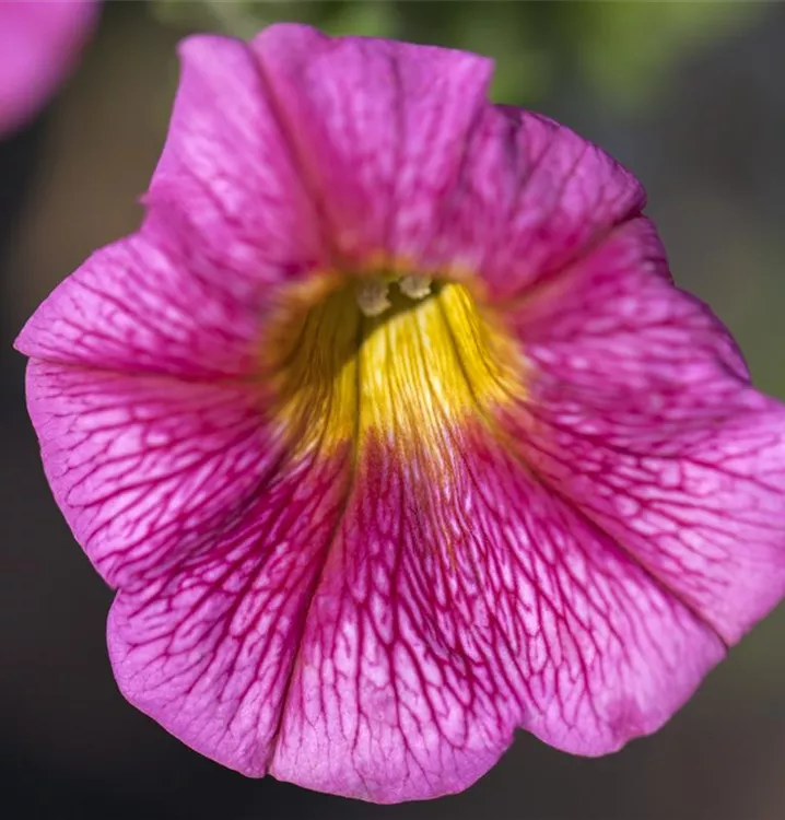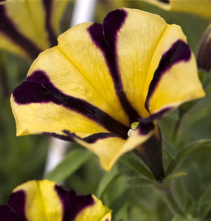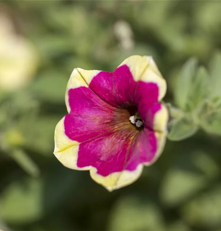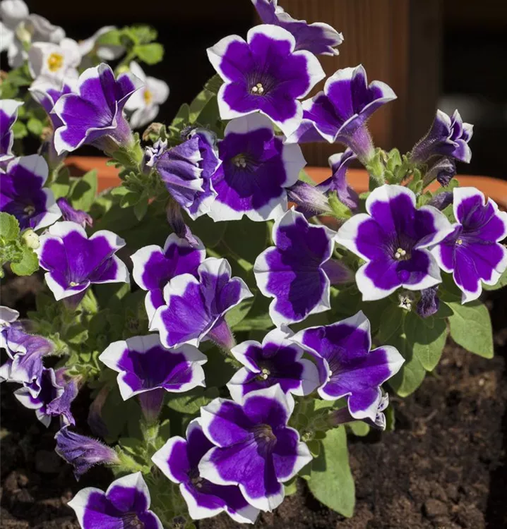 Petunia bildet während der gesamten Saison zahlreiche trichterförmige, bunte Blüten.