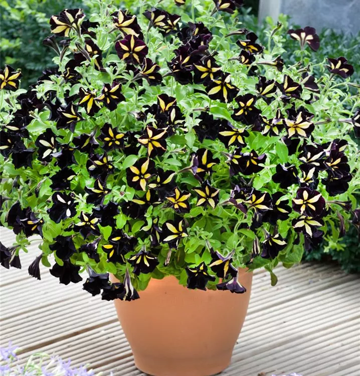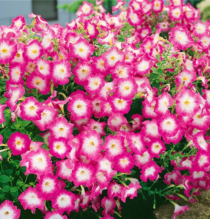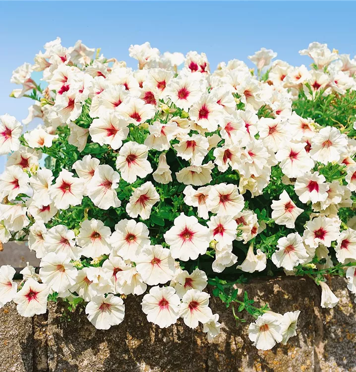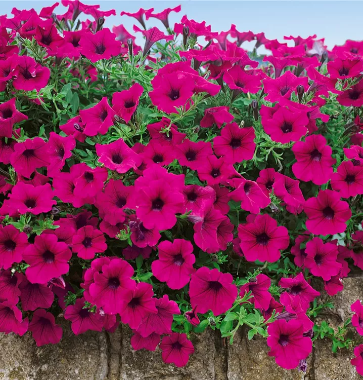 Die Petunie (Petunia x atkinsiana) ist eine beliebte Pflanze für den Balkon. Die unzähligen Blüten erscheinen, je nach Sorte, in verschiedenen Farben die ganze Saison hindurch. Ein sonniger Standort und ein durchlässiges Substrat werden bevorzugt.