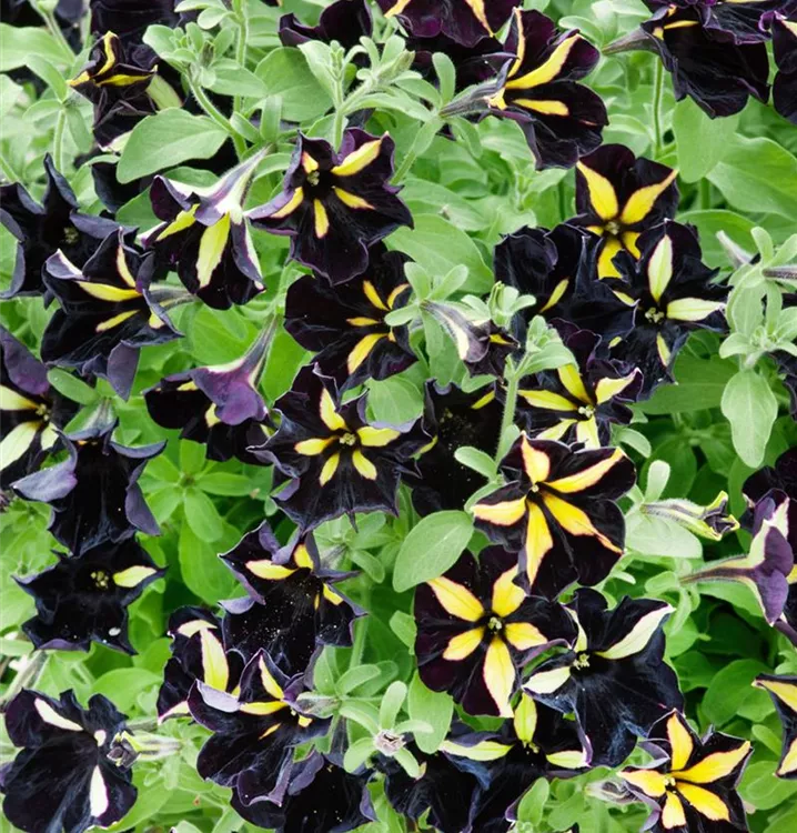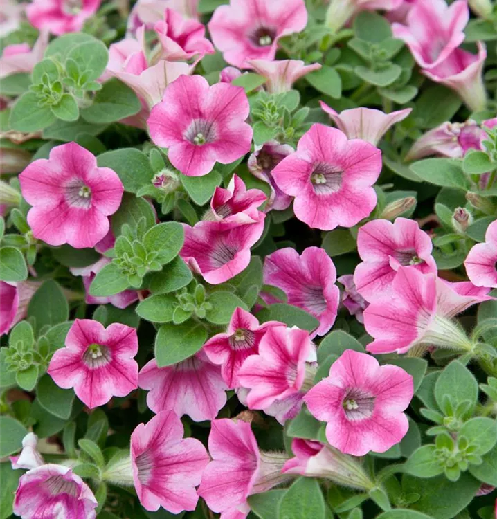 Petunia x atkinsiana bildet während der gesamten Saison zahlreiche trichterförmige, bunte Blüten.