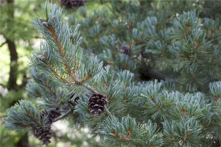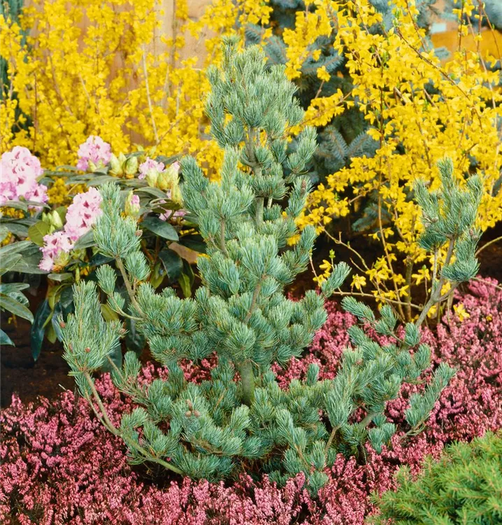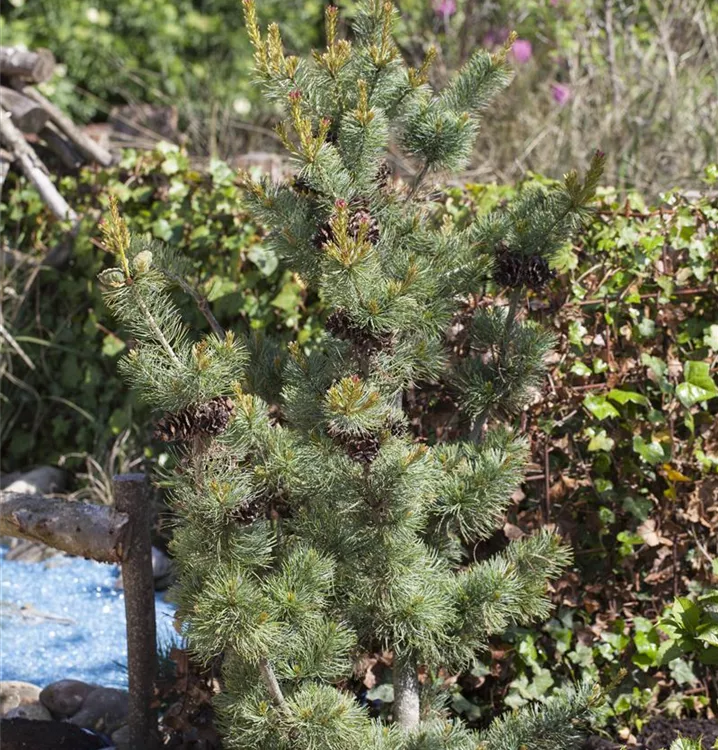 Die Blaue Mädchenkiefer 'Glauca' (Pinus parviflora) ist ein Kleinbaum, welcher aufrecht, ausladend, bizarr wächst und gewöhnlich eine Höhe von ca. 10 m und eine Breite von ca. 7 m erreicht. Ihre nadelförmigen Blätter haben eine silberblaue Färbung. Dieses Gehölz ist gut frostverträglich. Sie bevorzugt durchlässigen, kalkhaltigen Boden in sonniger Lage.