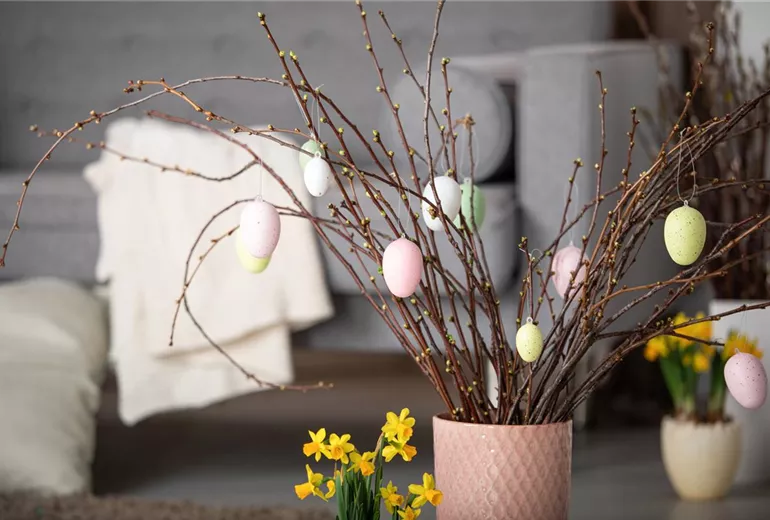 Alle Frühlingsblüher lassen sich gut mit anderer Osterdekoration wie zum Beispiel selbst bemalten oder gekauften Ostereiern oder kleinen Häschen kombinieren. Wer sich eine möglichst natürliche Dekoration wünscht, kann in eine Vase mit Schnittblumen aber auch einige Zweige stellen. Hierfür eignen sich zum Beispiel Zweige von Haselnusssträuchern oder der Korkenzieherweide. Durch die Wärme in den Wohnräumen sprießen bald die ersten Blätter. Dies nimmt jedoch etwas Zeit in Anspruch, deshalb werden Zweige am besten schon eine oder zwei Wochen vor Ostern in eine Vase gestellt. Eine beliebte Osterdekoration sind außerdem Körbe aller Art. Sie lassen sich mit schönen Frühlingsblühern wie den Narzissen, Hyazinthen oder mit kleinen Hornveilchen bepflanzen. Mit weiterer Deko wie zum Beispiel ein wenig Moos entsteht ein Ensemble für den Tisch oder den Platz vor der Haustür. Weil Frühlingsblüher winterhart sind, kann der Korb selbst bei sehr niedrigen Temperaturen im Freien bleiben. Ein wenig Vorsicht ist jedoch bei Frühlingsblühern aus dem Gewächshaus geboten. Sie sollten langsam an die Kälte gewöhnt und deshalb an den ersten Abenden möglichst ins Haus geholt werden.