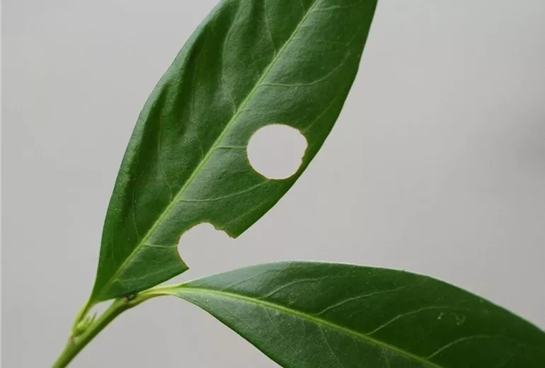 Auf den Blättern entstehen braune bis rotbraune Flecken. Das befallene Gewebe trocknet ein und fällt anschließend aus dem Blatt heraus, so dass im Blatt Löcher entstehen. Zum Teil sehen die Schäden aus wie ein Buchtenfraß durch den Dickmaulrüssler.