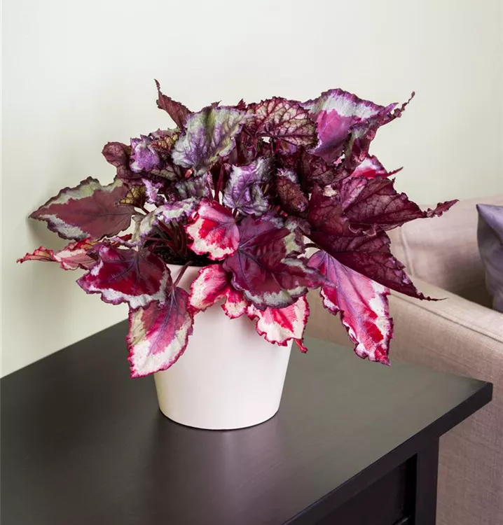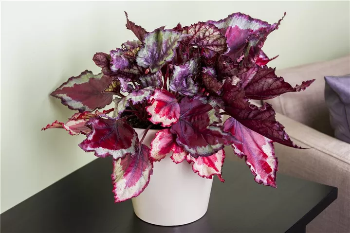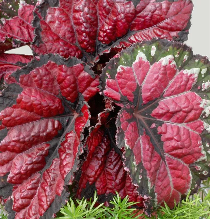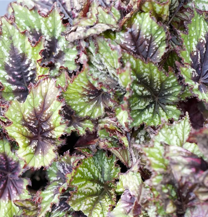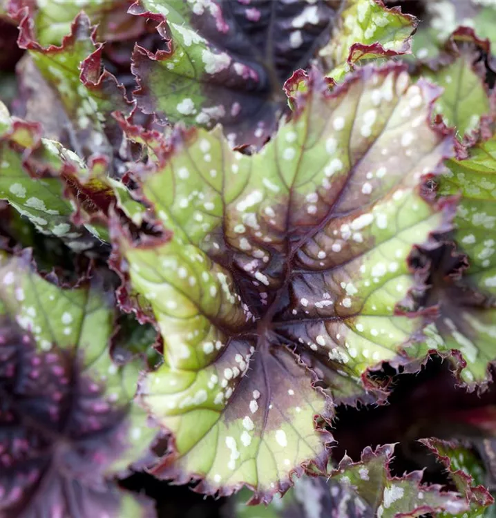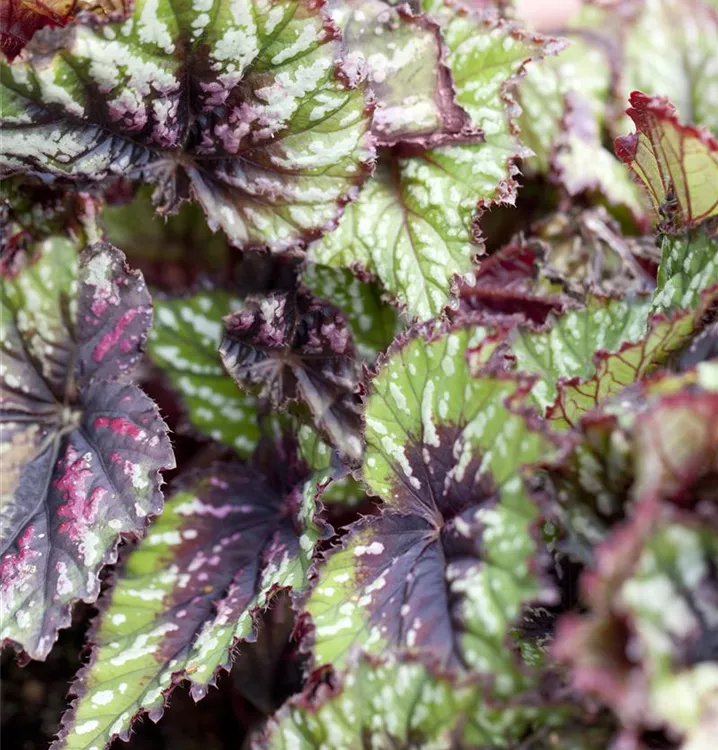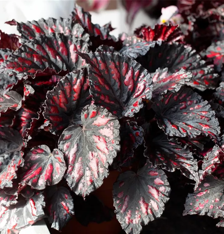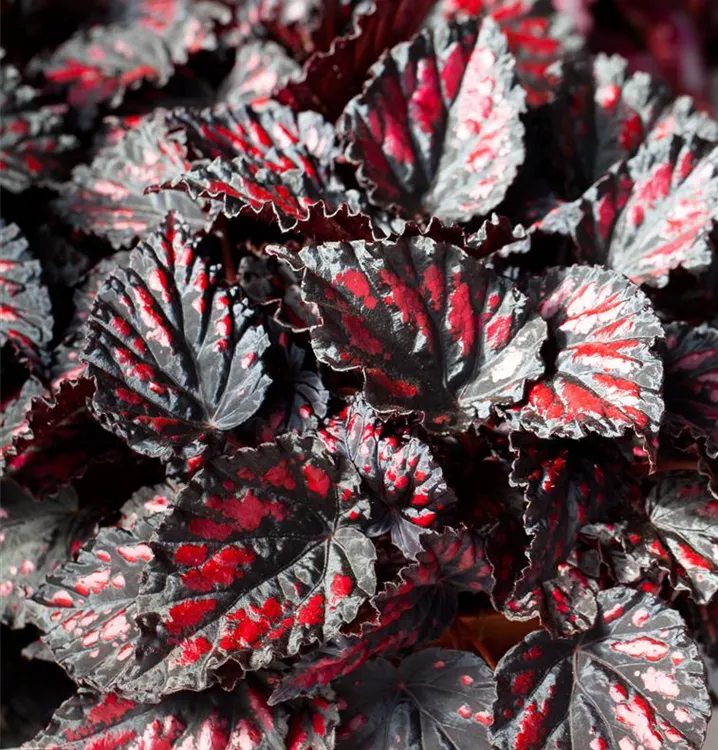 Hoher Blattschmuckwert. Die immergrünen Blätter der Königsbegonie sind bunt, herzförmig, gewellt.