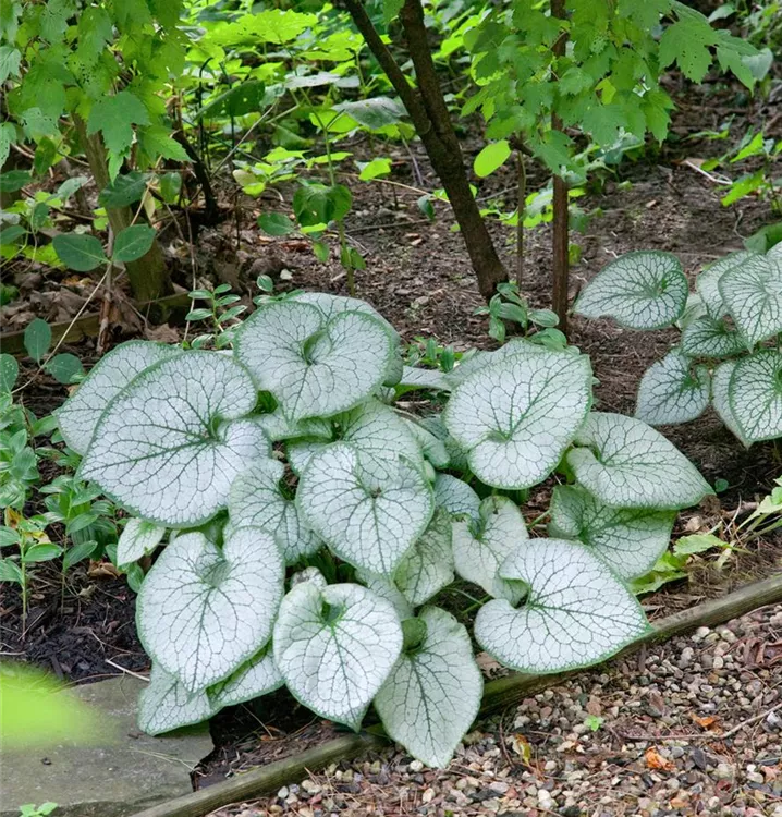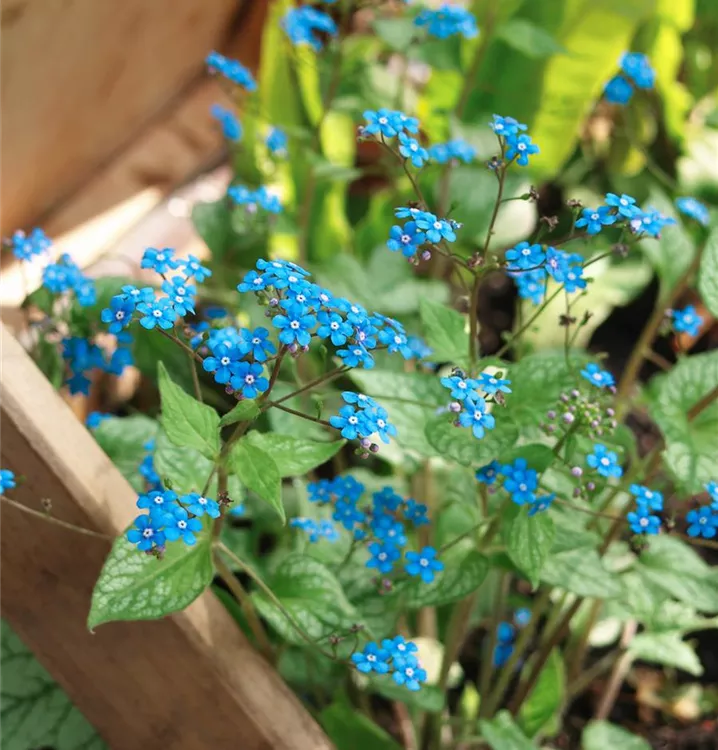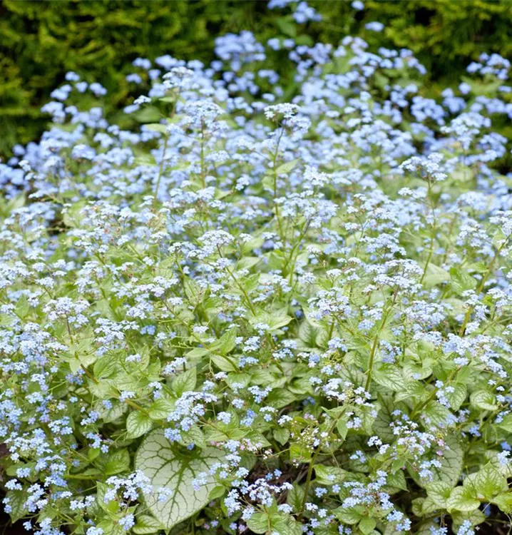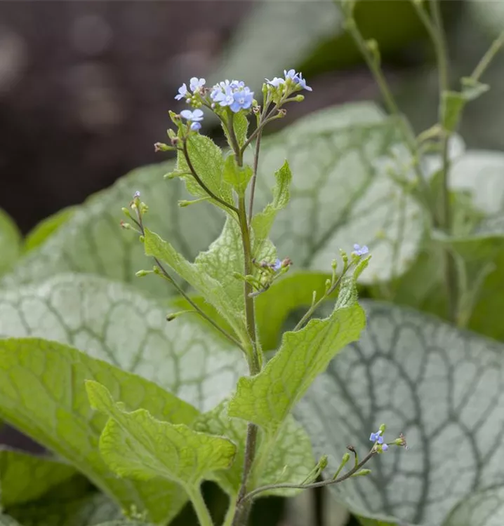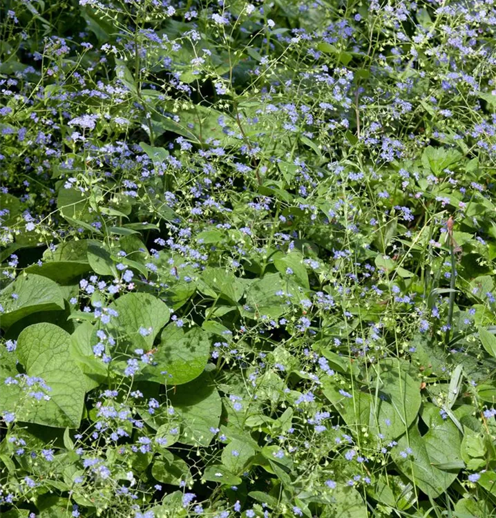 Das Kaukasus-Vergissmeinnicht (Brunnera macrophylla) ist eine ausladende, breite Staude mit dekorativen, herzförmigen, dunkelgrünen Blättern. An einem sonnigen bis halbschattigen Standort mit durchlässigem, humosem, nährstoffreichem, lehmigem Boden erreicht es gewöhnlich eine Höhe von ca. 40 cm und wird ca. 40 cm breit. Das Kaukasus-Vergissmeinnicht ist gut frostverträglich.