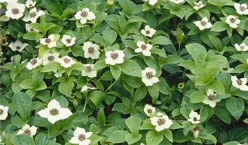 Der Teppich-Hartriegel (Cornus canadensis) ist ein teppichartiger Halbstrauch mit dekorativen, roten, runden Früchten. Die Blüten erscheinen je nach Sorte in verschiedenen Farben.