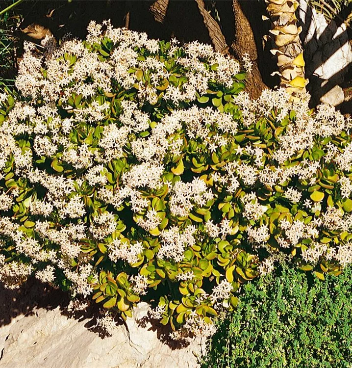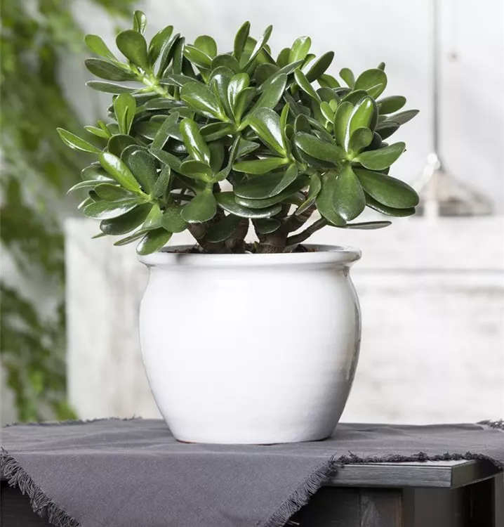 Der Geldbaum (Crassula ovata) ist eine Pflanze mit dunkelgrünen, dickfleischigen Blättern. Diese aufrechte Pflanze gedeiht am besten an einem sonnigen Standort.