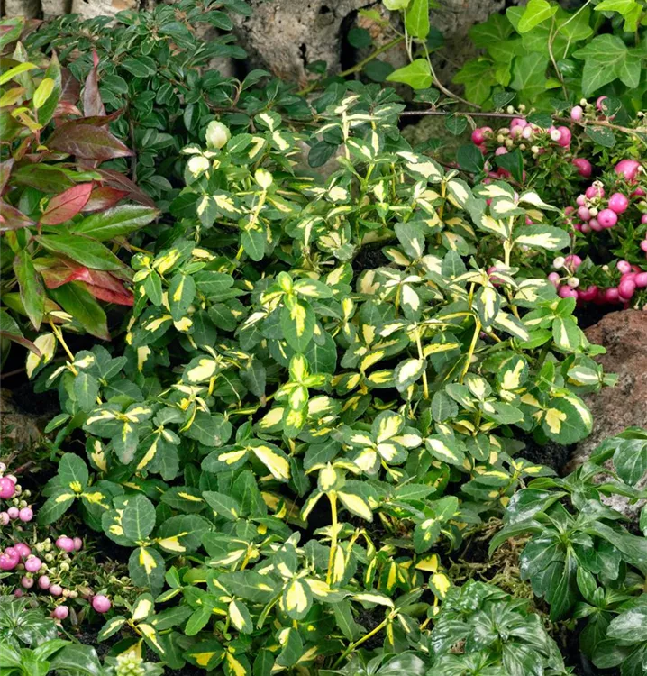 Die Kriechspindel (Euonymus fortunei) ein Kleinstrauch, der, je nach Sorte, Blüten in verschiedenen Farben hervorbringt. An einem sonnigen bis halbschattigen Standort mit durchlässigem, humosem Boden erreicht sie gewöhnlich eine Höhe von ca. 60 cm und wird ca. 90 cm breit.