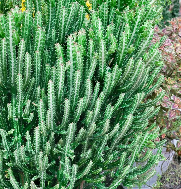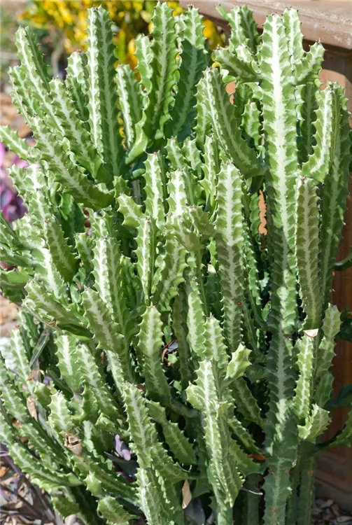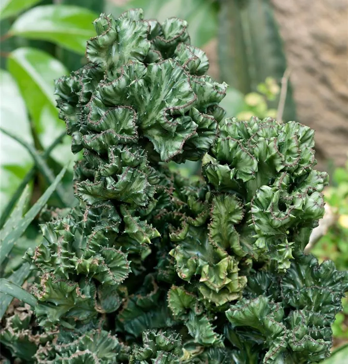 Die Euphorbia lactea (Euphorbia lactea) trägt hellgrüne, rundliche, gezähnte Blätter. Diese bizarre und sukkulente Pflanze gedeiht am besten an einem sonnigen Standort.