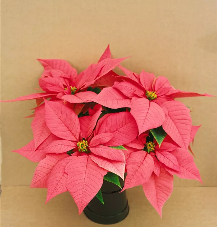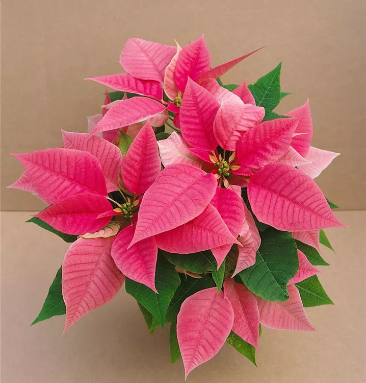 Der Weihnachtsstern (Euphorbia pulcherrima) ist eine rosa blühende Pflanze, die breit lanzettliche, lanzettliche Blätter trägt. Diese buschige Pflanze gedeiht am besten an einem sonnigen Standort.
