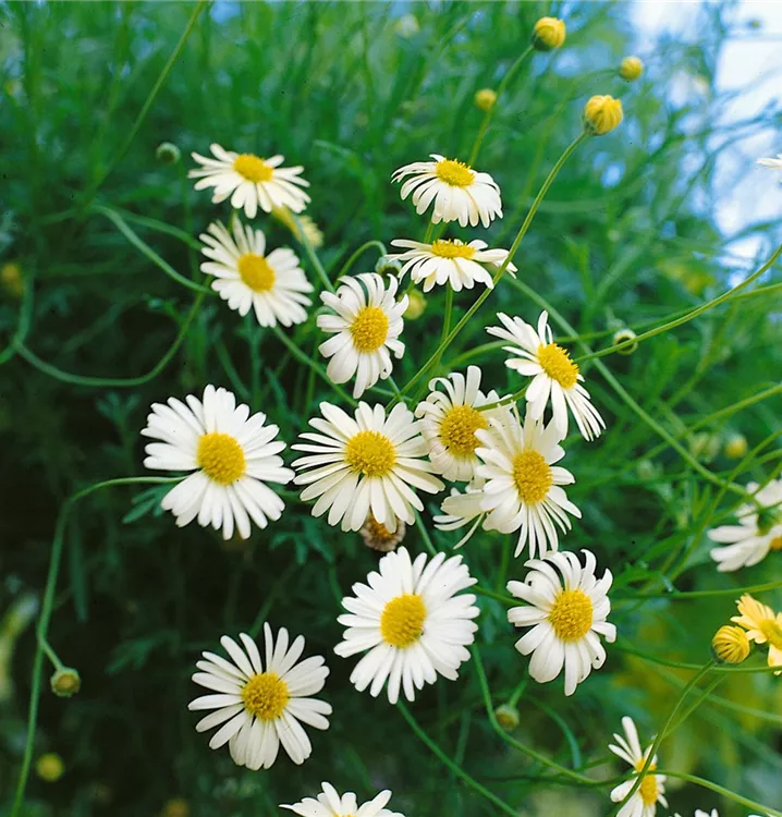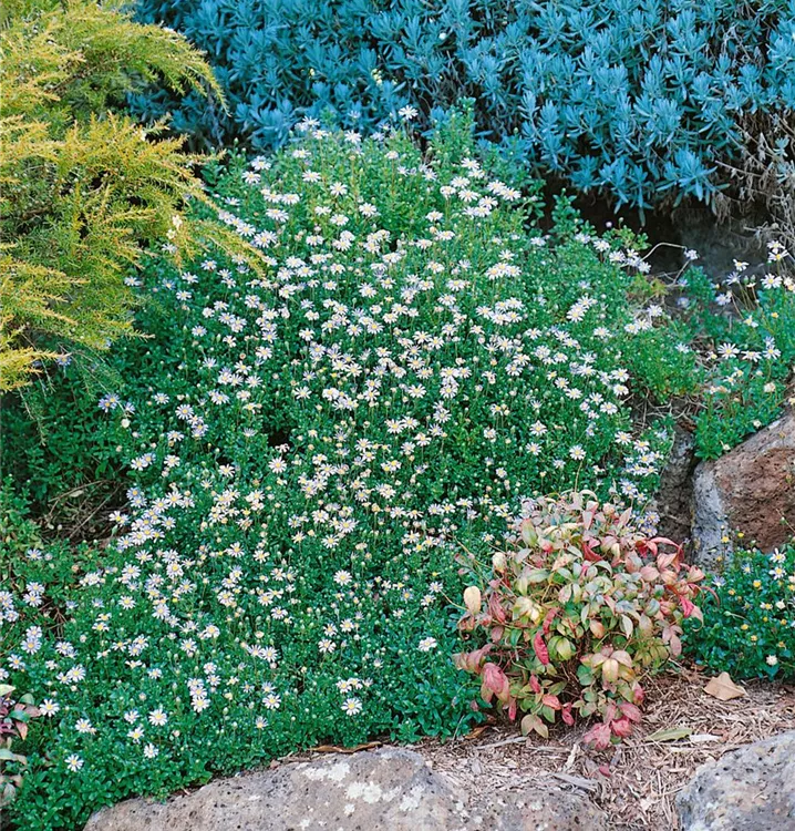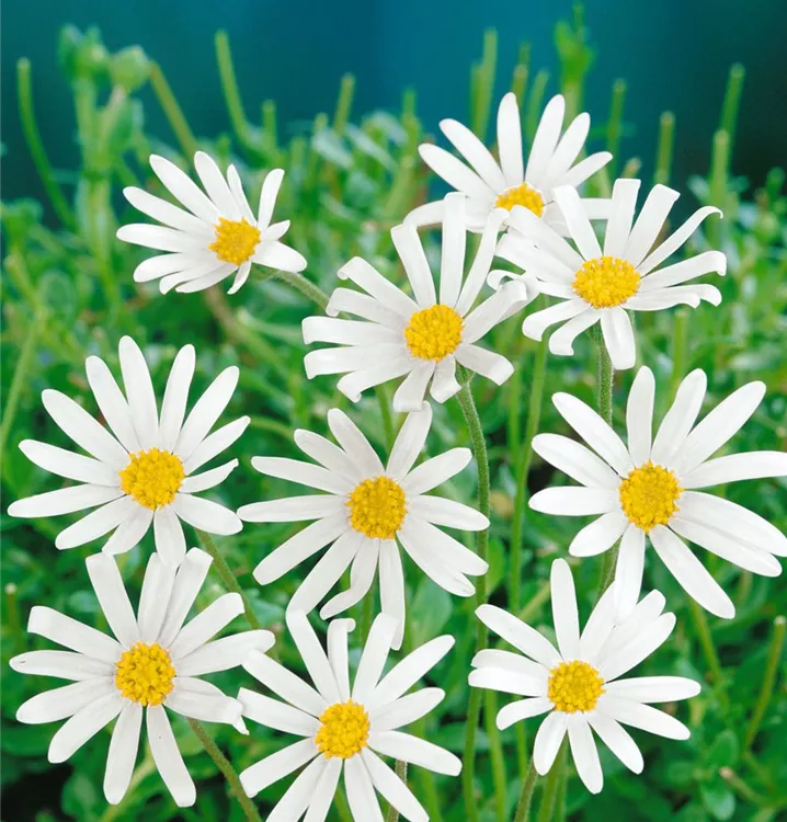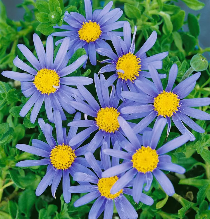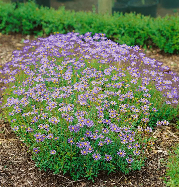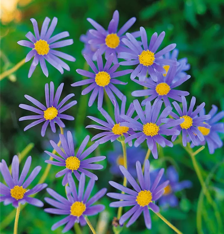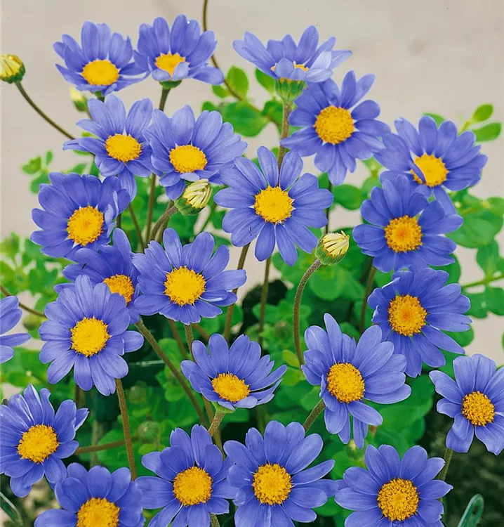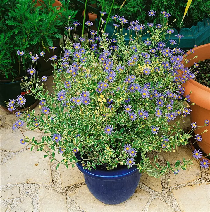 Die Blaue Kapaster (Felicia amelloides) ist eine beliebte Pflanze für den Balkon. Die unzähligen Blüten erscheinen, je nach Sorte, in verschiedenen Farben die ganze Saison hindurch. Ein sonniger Standort und ein durchlässiges Substrat werden bevorzugt.