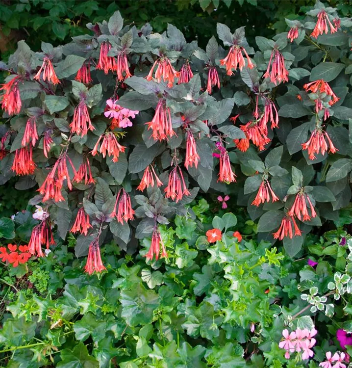 Fuchsia 'Koralle' bildet während der gesamten Saison zahlreiche glockenförmige, lachsrosafarbene Blüten.