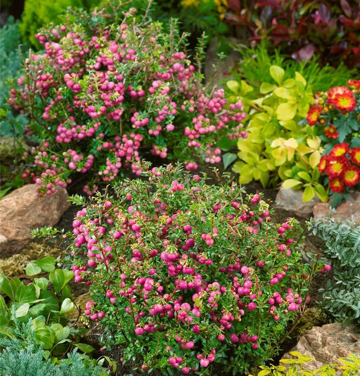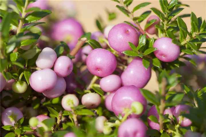 Besonders dekorativ sind die rosaroten, runden Beeren von Gaultheria mucronata. Diese erscheinen ab September.