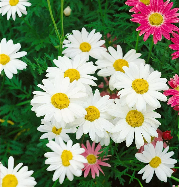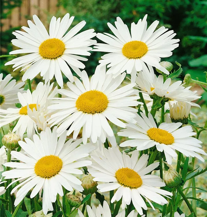 Die Kleine Margerite (Leucanthemum vulgare) ist eine aufrechte Staude, die von Juli bis September weiße, körbchenartige Blüten bildet. An einem sonnigen bis halbschattigen Standort mit durchlässigem Boden erreicht sie gewöhnlich eine Höhe von ca. 40 cm und wird ca. 40 cm breit. Die Kleine Margerite ist gut frostverträglich.