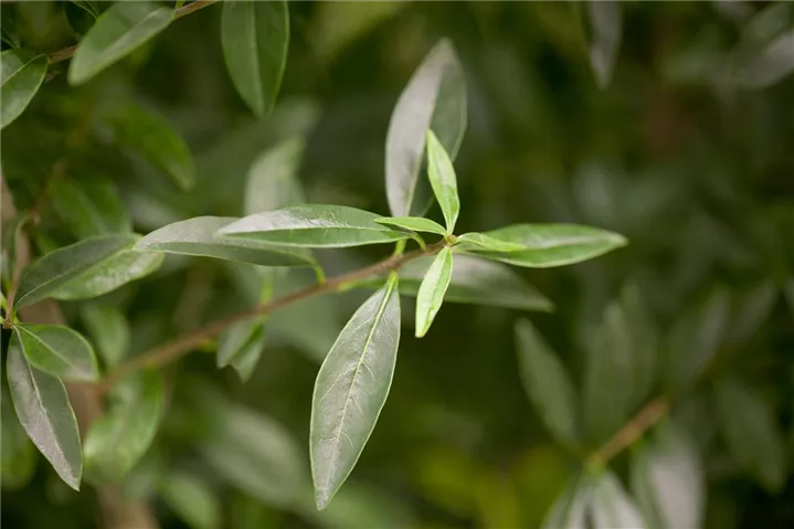 Die wintergrünen Blätter des Gemeinen Ligusters sind dunkelgrün, lanzettlich, ledrig, gegenständig.