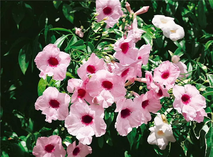 Pandorea jasminoides bildet während der gesamten Saison zahlreiche rosafarbene Blüten.