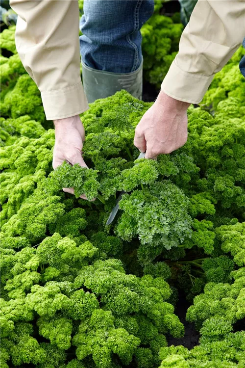 Zum Verzehr geeignet. Die dunkelgrünen, gewellten Blätter sind gefiedert und überzeugen mit aromatischem Geschmack.