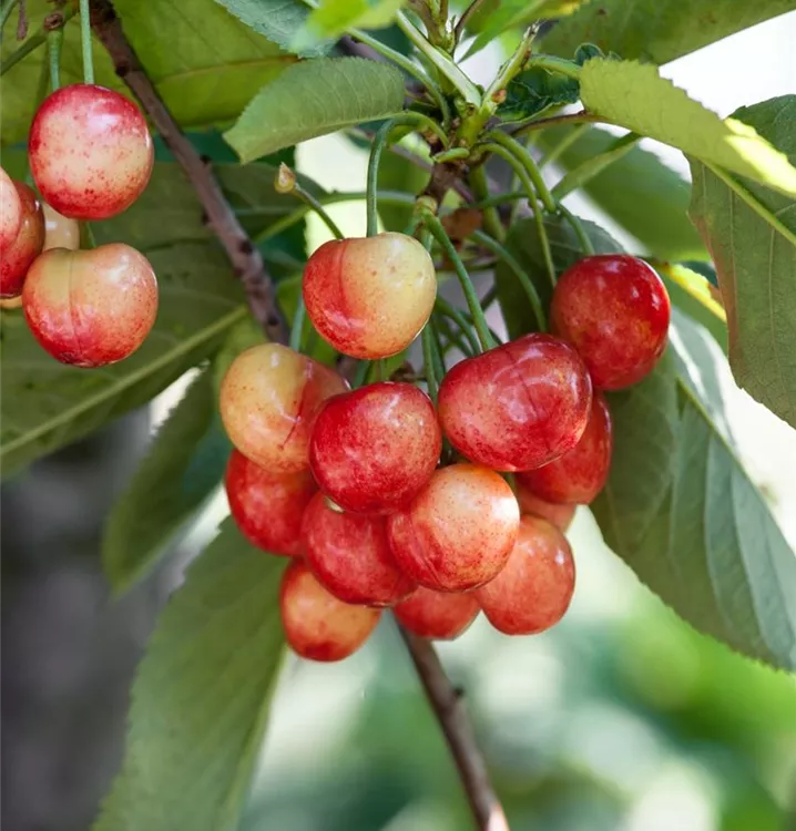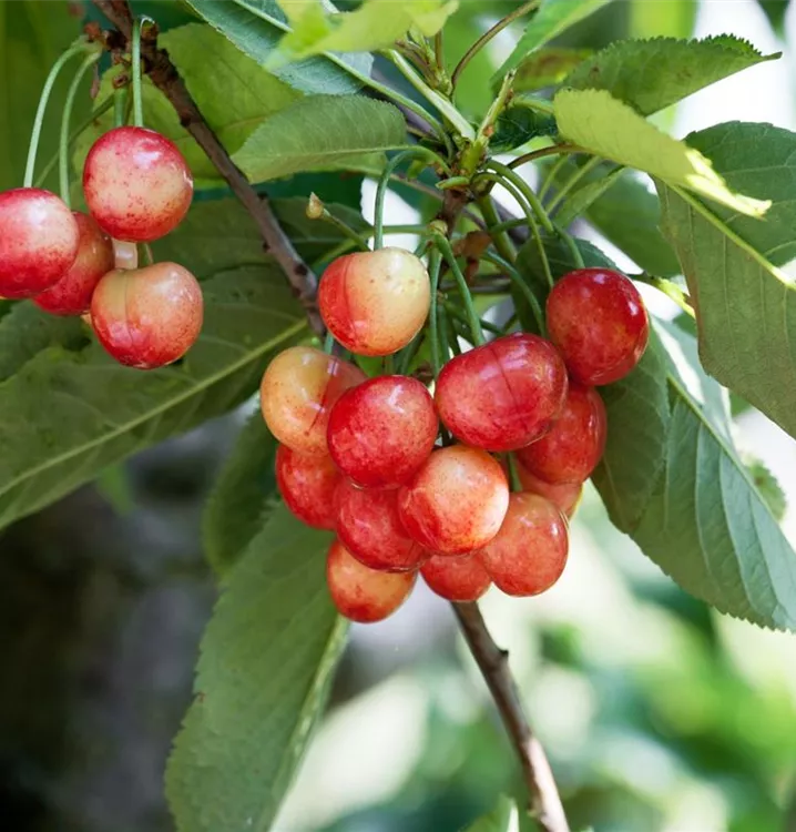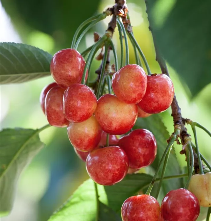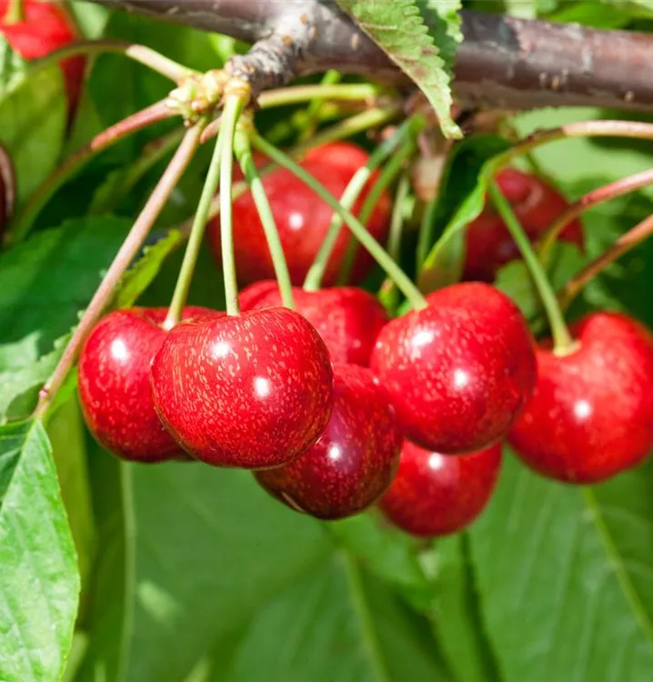 Die roten Steinfrüchte haben einen süßen, aromatischen Geschmack. Reifezeit ab Juni.