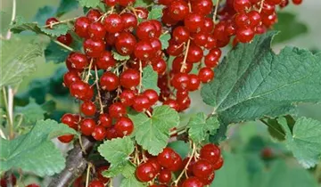 Die Johannisbeere 'Jonkheer van Tets' (Ribes rubrum) bildet dunkelrote, sehr große Beeren. Säuerlich, aromatisch im Geschmack, besitzt die Johannisbeere 'Jonkheer van Tets' eine dünne Schale. Für eine ertragreiche Ernte ab Juni schaffen durchlässiger, nährstoffreicher Boden und ein sonniger bis halbschattiger Standort optimale Bedingungen. Auch ihre grünen Blüten sind eine schöne Erscheinung.