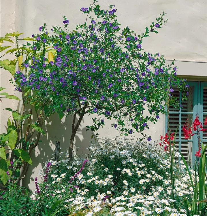 Der Enzianbaum (Solanum rantonnetii) ist eine sehr beliebte Kübelpflanze. Seine blauen Blüten sind sternförmig und erscheinen von Mai bis Oktober. Verwenden Sie bevorzugt die spezielle Kübelpflanzenerde, denn sie verdichtet sich über längere Zeit nicht.
