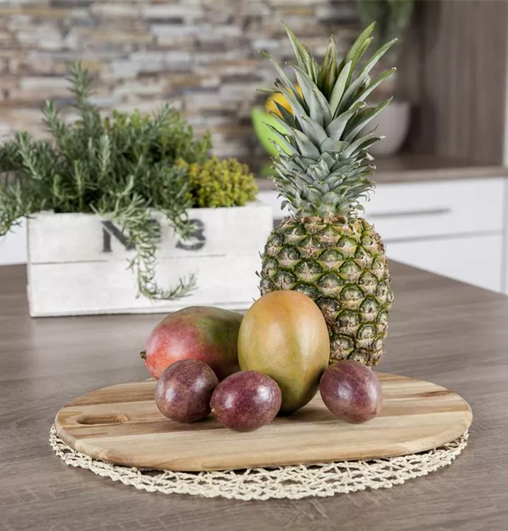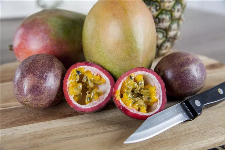 Die Maracuja (Passiflora edulis) bildet braune Früchte. Sie haben einen süßen, exotischen Geschmack. Für eine ertragreiche Ernte ab September schaffen durchlässiger, lockerer Boden und ein sonniger bis halbschattiger Standort optimale Bedingungen. Auch ihre zweifarbigen, leicht duftenden Blüten sind eine schöne Erscheinung.